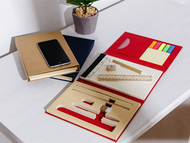 Set sadrži: drveni lenjir, hemijsku olovku, zarezač, gumicu za brisanje, dve olovke, blok za beleške sa 40 listova, PVC lenjir, nalepnice za obeležavanje i nalepnice za poruke